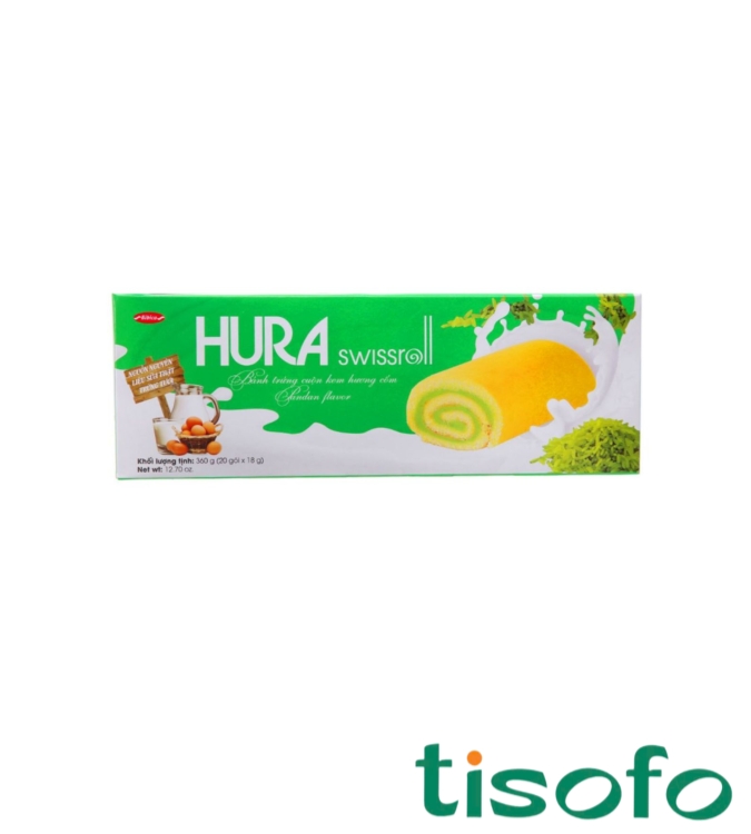 Bánh bông lan với lớp bông lan bên ngoài xốp, phồng dai ngon không bị cứng bánh. Bánh trứng cuộn kem hương cốm Hura Swissroll hộp 360g còn có lớp kem hương cốm ngọt thanh, béo ngậy cuộn bên trong hấp dẫn. Bánh bông lan Hura chất lượng, thích hợp làm quà hoặc ăn vặt gia đình.