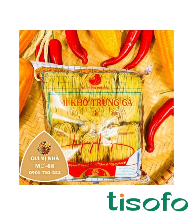 Sản phẩm mì khô trứng gà nổi tiếng của Du Hưng Phong. Bịch gồm 12 vắt nhỏ, trọng lượng bịch 454gr.