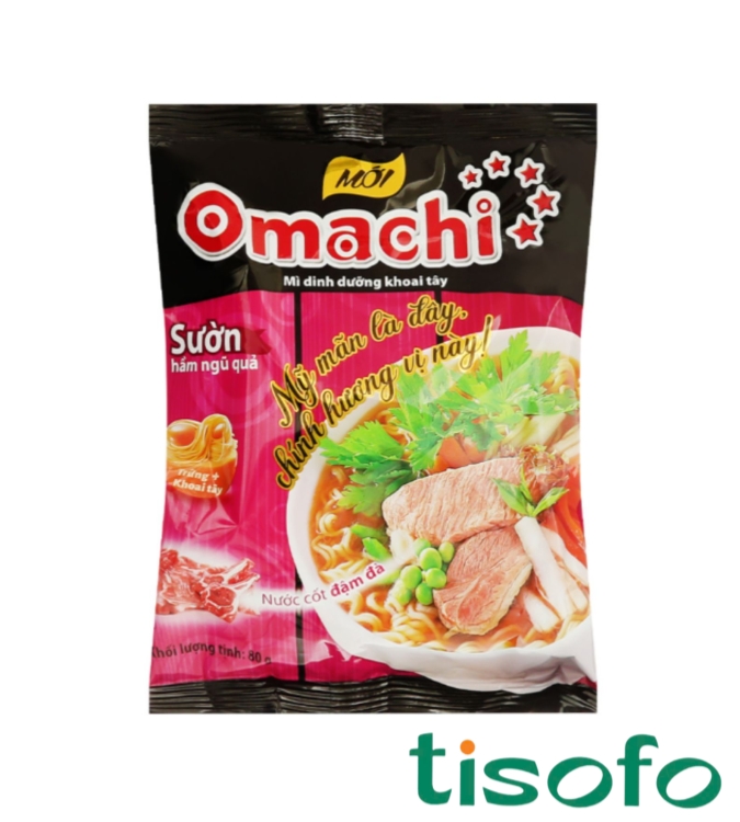 Sợi mì từ trứng và khoai tây vàng dai ngon hòa quyện trong nước súp mì Omachi vị sườn hầm ngũ quả đậm đà cùng hương thơm nứt mũi tạo ra siêu phẩm mì với sự kết hợp hương vị hài hòa, độc đáo. Mì khoai tây Omachi sườn hầm ngũ quả gói 80g tiện lợi, thơm ngon hấp dẫn